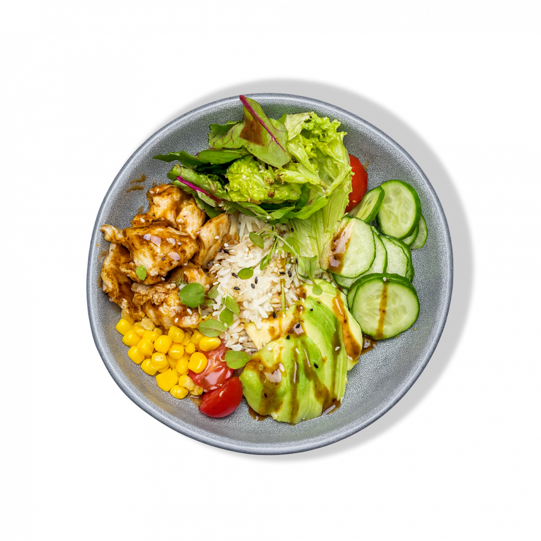 куриное филе, рис, авокадо, огурец, черри, кунжут, микс салата, соус азиатский, кукуруза