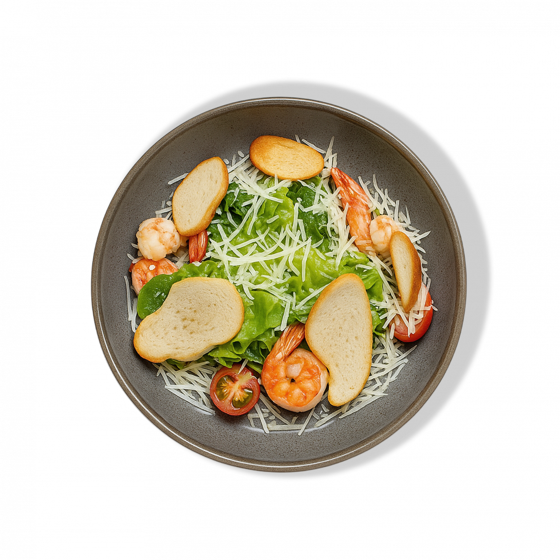 Сочные тигровые креветки на свежем миксе салатов, щедрые хлопья пармезана. Фирменный соус цезарь добавляет сливочности и баланса, подчёркивая сладковатый вкус креветок и яркость томатов черри.