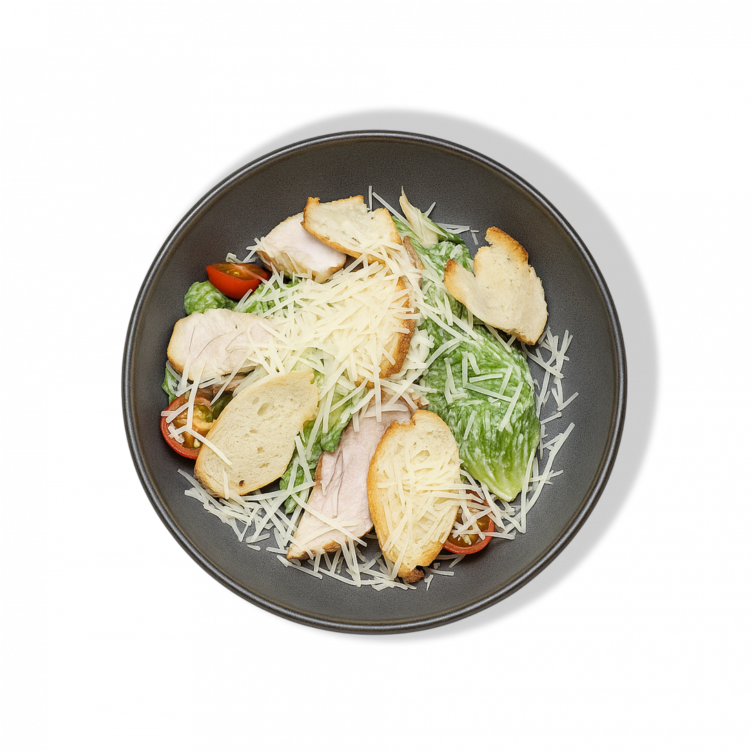 Классический салат в современной подаче: сочное куриное филе, хрустящие чипсы из багета и щедрые хлопья пармезана на свежем миксе салатов. Лёгкая сливочность фирменного соуса цезарь и сладость томатов черри создают сбалансированный вкус — сытно, но не тяжело.
