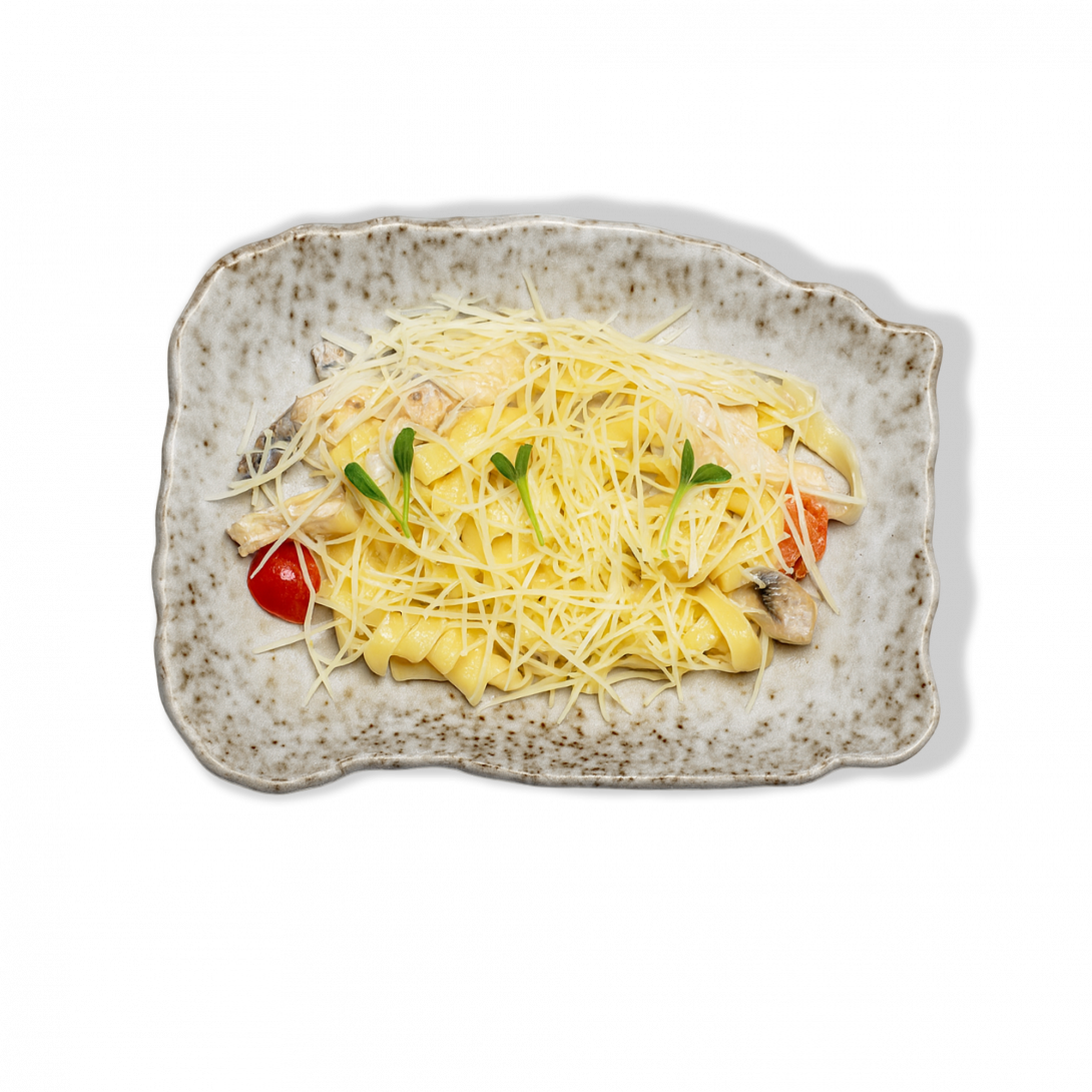 Нежная паста с куриным филе и шампиньонами в сливочном соусе, дополненная пармезаном. Классика, которая всегда уместна — сытно, сливочно, гармонично.