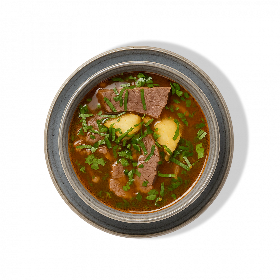 Насыщенный говяжий бульон с томлёными кусками мяса, овощами гриль и ароматной зеленью. Мягкий картофель, сладкий перец и томаты придают глубину вкуса, а лук и кинза добавляют свежий акцент. Домашнее, тёплое, по-домашнему щедрое блюдо.