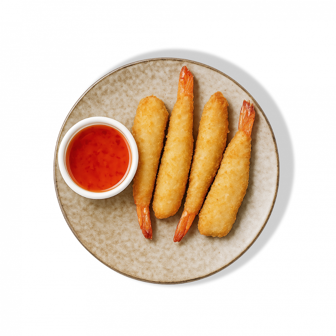 Нежные креветки в хрустящей панировке, обжаренные до золотистой корочки и поданные с ярким соусом свит чили — пикантная и сочная закуска.