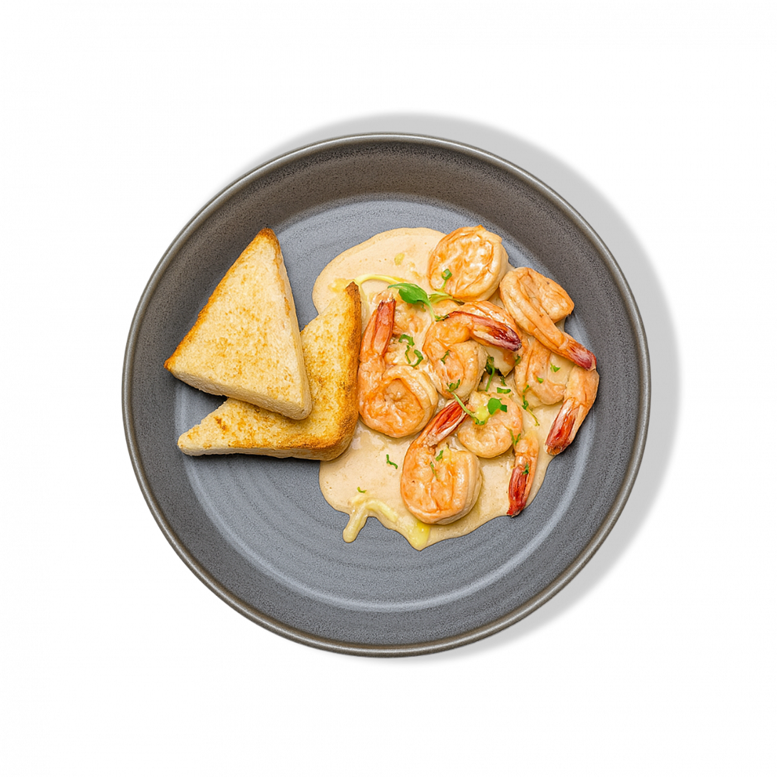 Нежные тигровые креветки в сливочном соусе с сыром блю-чиз и ароматом чеснока. Подаются с чиабаттой — идеальное сочетание для гурманов.