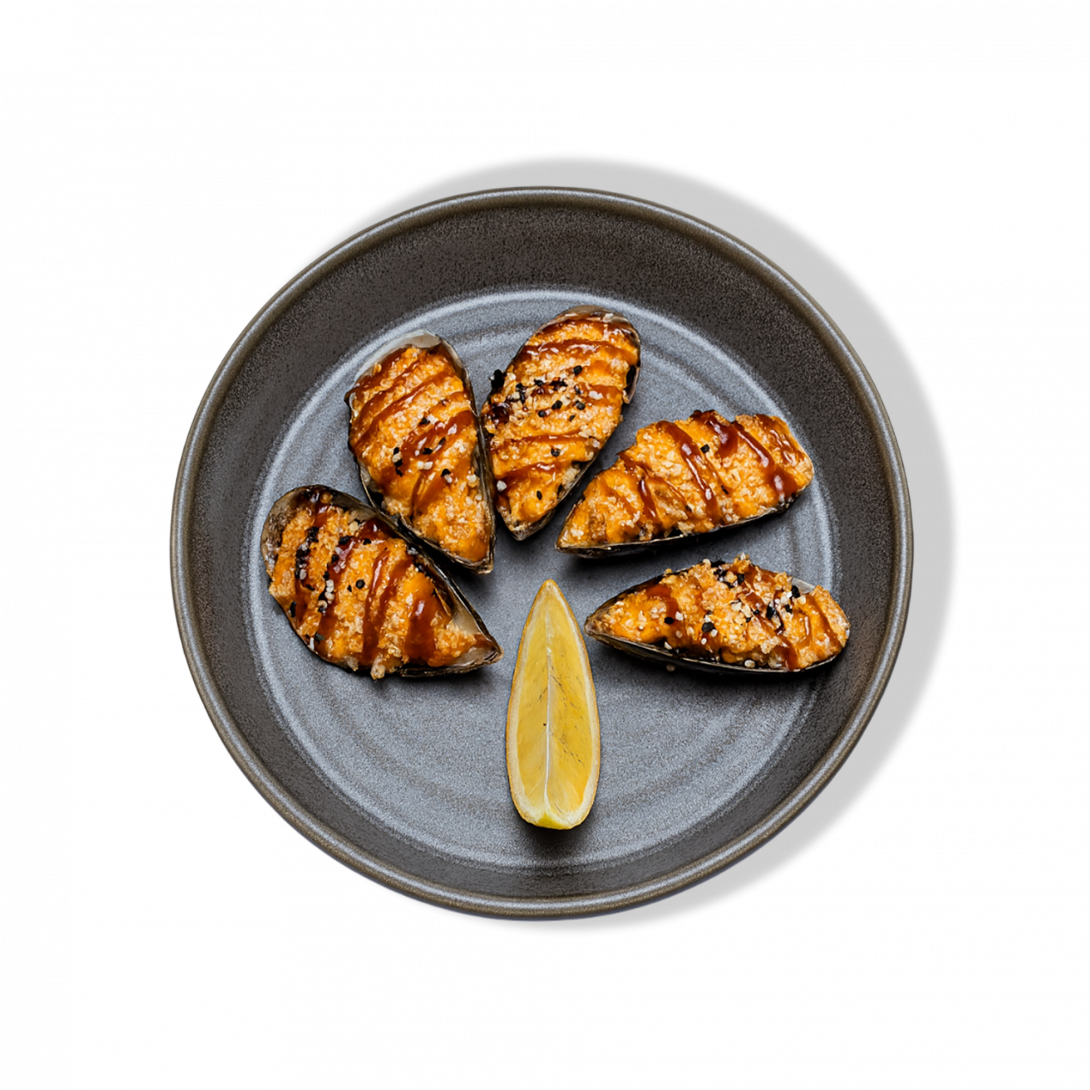 Запечённые мидии — сочные, насыщенные, в пикантном соусе спайси с добавлением терияки. Идеальны как горячая закуска к вину или как самостоятельное блюдо для ценителей морепродуктов.