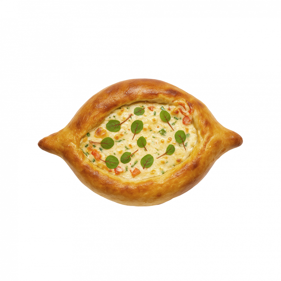 Ароматная лодочка с тигровыми креветками, шпинатом и томатами в нежном сливочном соусе. Тонкое тесто и тягучий сыр создают насыщенный вкус, который хочется запомнить.
