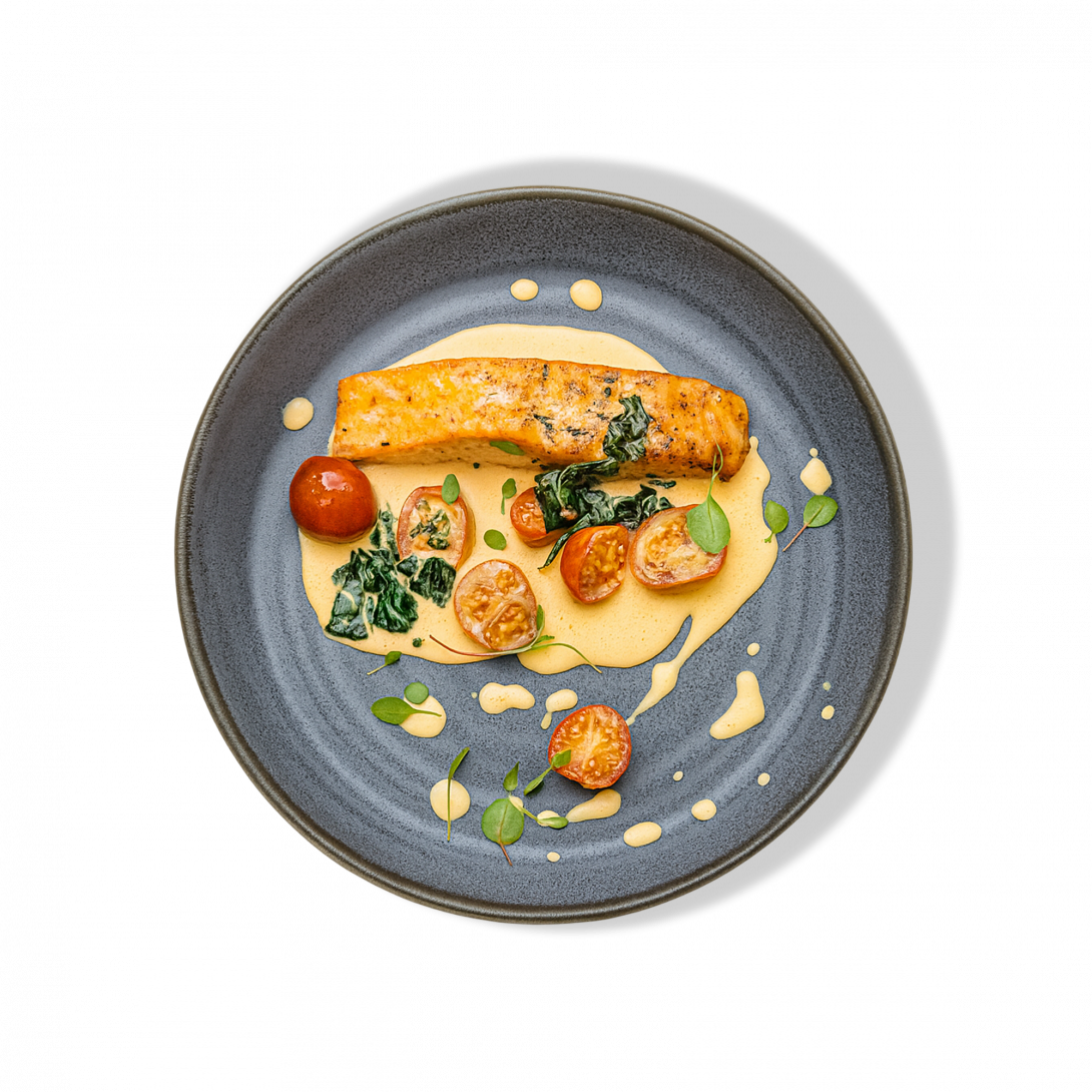 Сочное филе лосося в нежном сливочном соусе, томатами черри и листьями шпината. Лёгкое и изысканное блюдо с натуральным вкусом.
