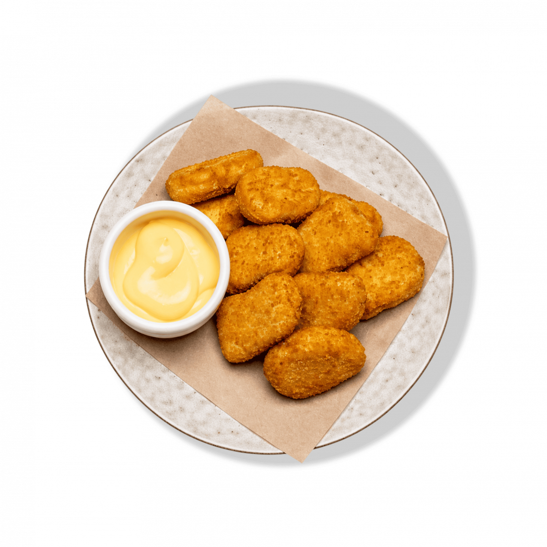 Золотистые куриные наггетсы с хрустящей корочкой, подаются с сырным соусом — простая и любимая закуска для любого случая.