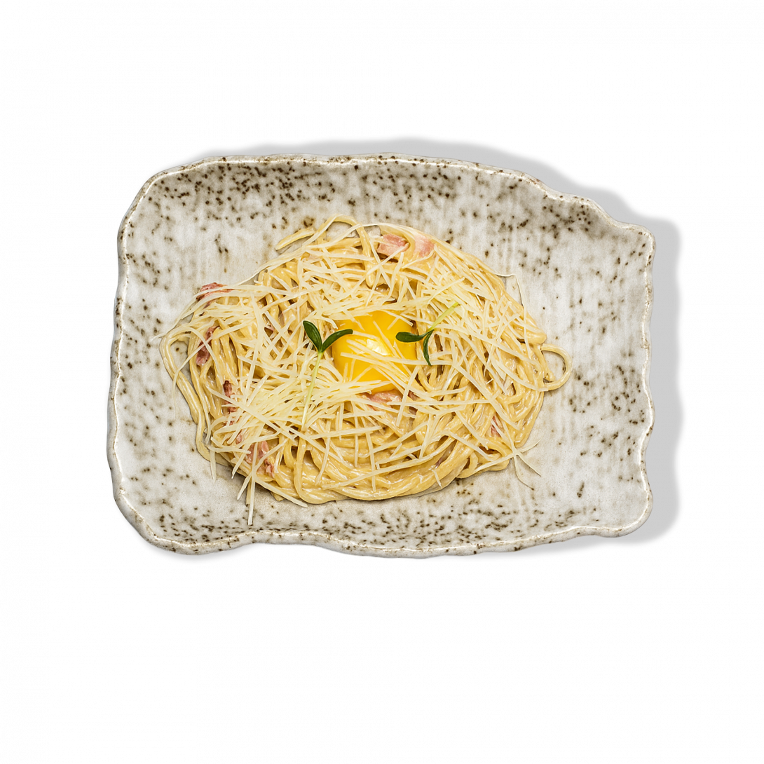 Классическая паста в сливочно-яичной эмульсии с беконом и тёртым пармезаном. Насыщенный вкус и сытность — как в уютной траттории в сердце Рима.