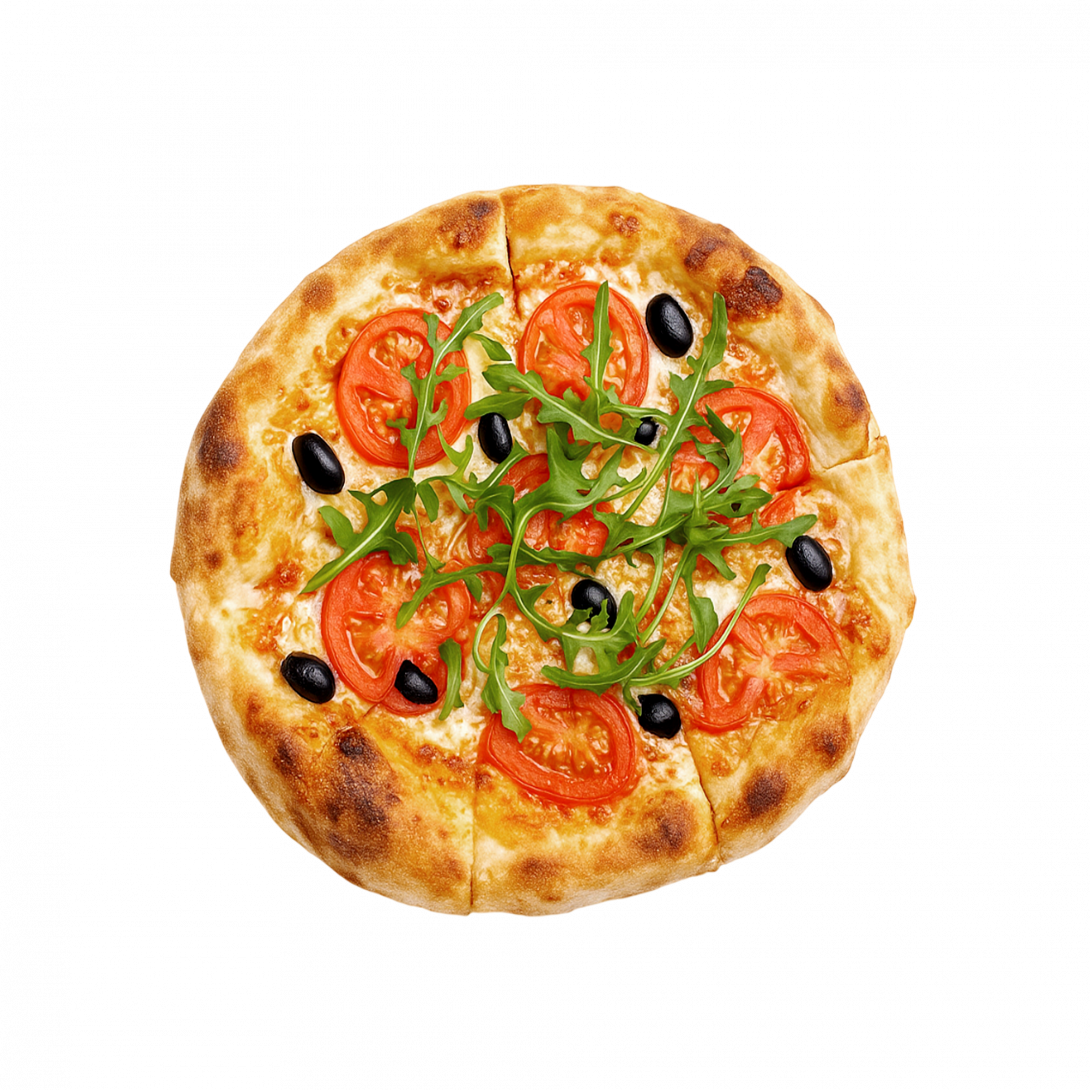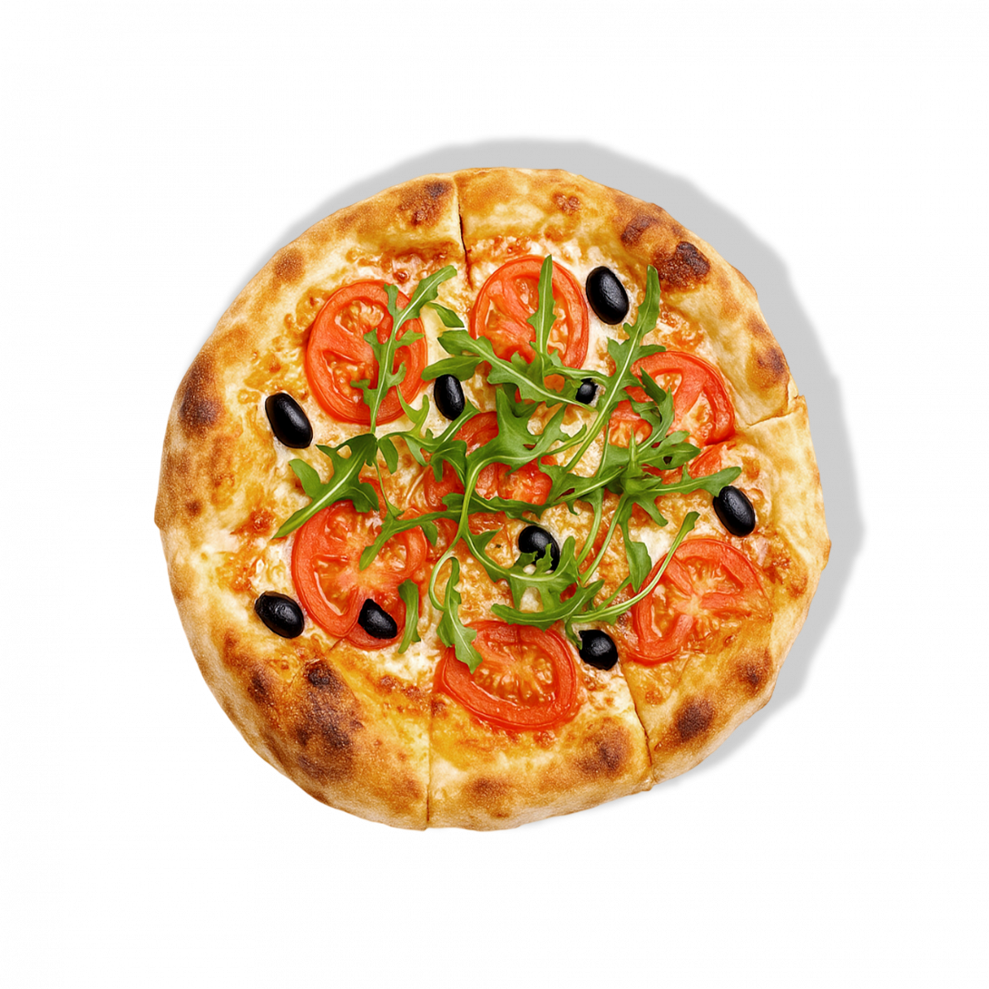 Классическая мини-пицца с томатным соусом, сочными томатами и моцареллой. Маслины добавляют лёгкую пикантность, а руккола — свежий акцент.