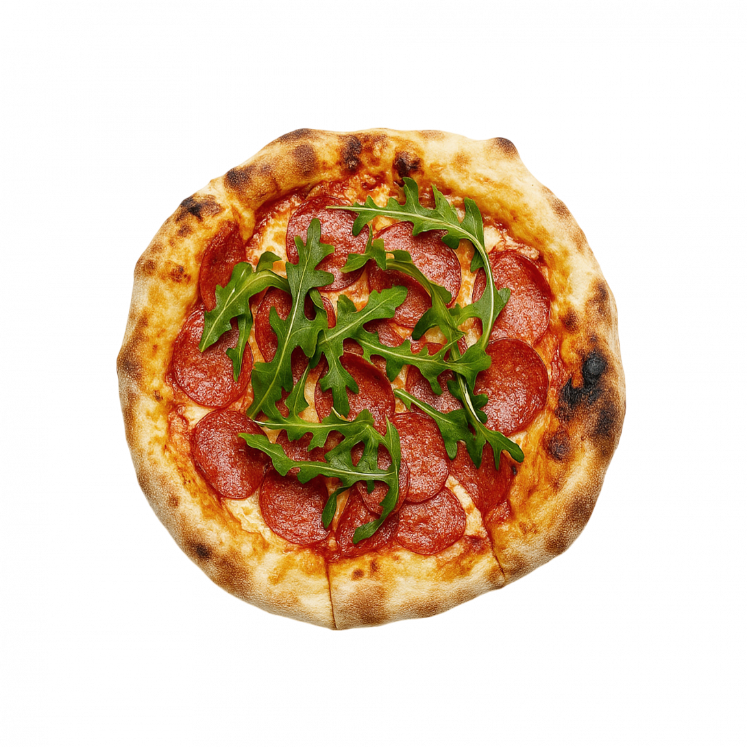 Мини-пицца с пряными колбасками пепперони, тянущейся моцареллой и ароматным базиликом. Идеальный выбор для тех, кто любит поострее.