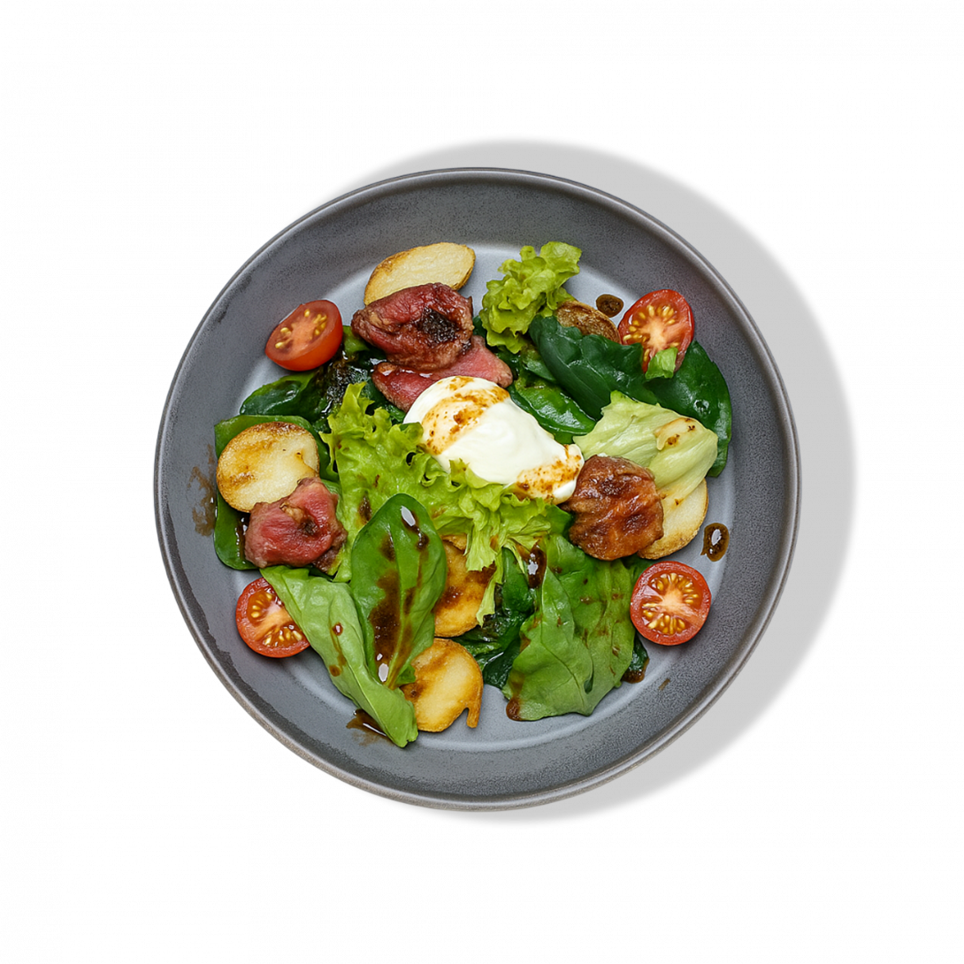 Нежный ростбиф и тёплый картофель беби, дополненные карамелизованными черри и бархатным крем-чизом. Азиатский соус с лёгкой кислинкой подчёркивает вкус и придаёт баланса.