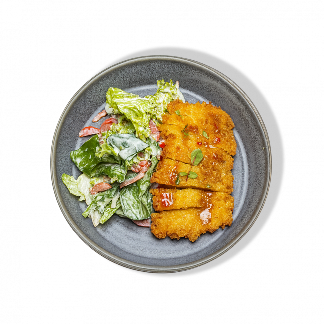 Хрустящий куриный шницель на подушке из свежих овощей: огурцы, томаты, сладкий перец и немного лука. Домашний соус придаёт сочность и насыщенность, а щепотка кинзы добавляет лёгкую пряную ноту.