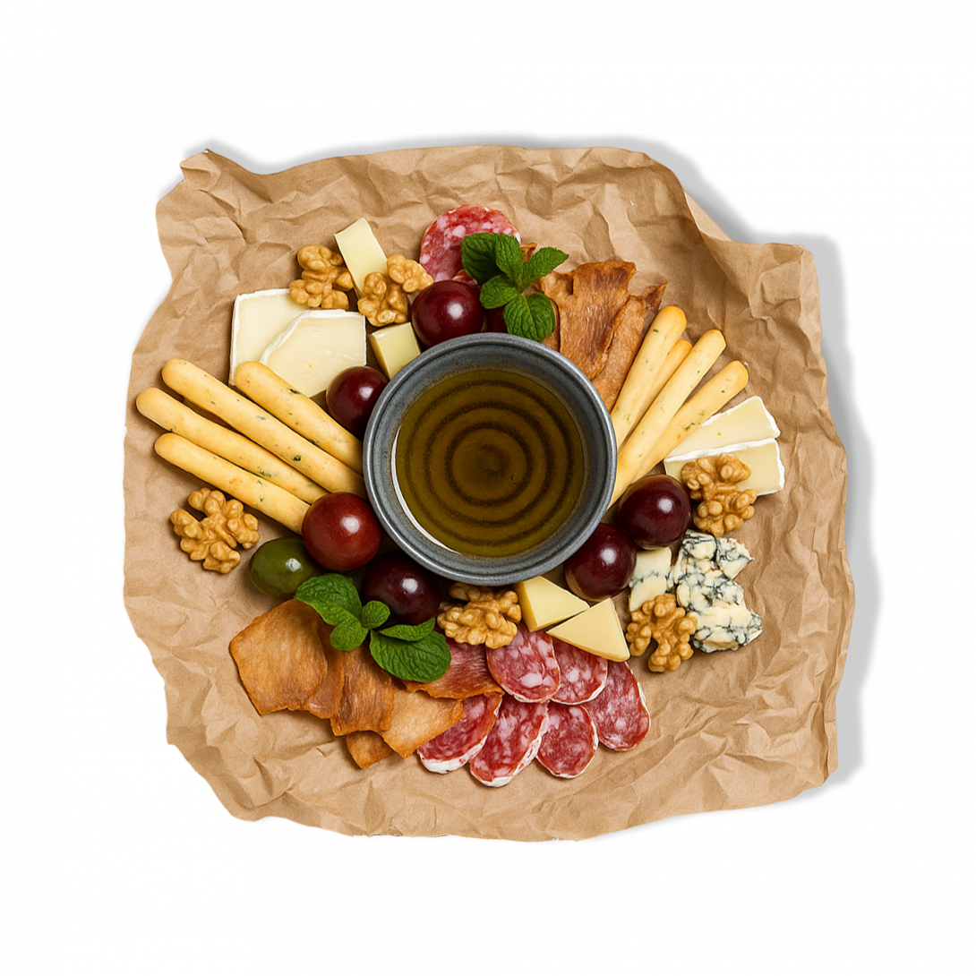 Идеальное сопровождение для бокала вина — изысканный набор деликатесов: ароматный фуэт, хрустящие куриные чипсы, благородные сыры (пармезан, дор-блю, камамбер), гриссини, мёд, виноград, грецкий орех и маслины. Лёгкая закуска с атмосферой аперитива.