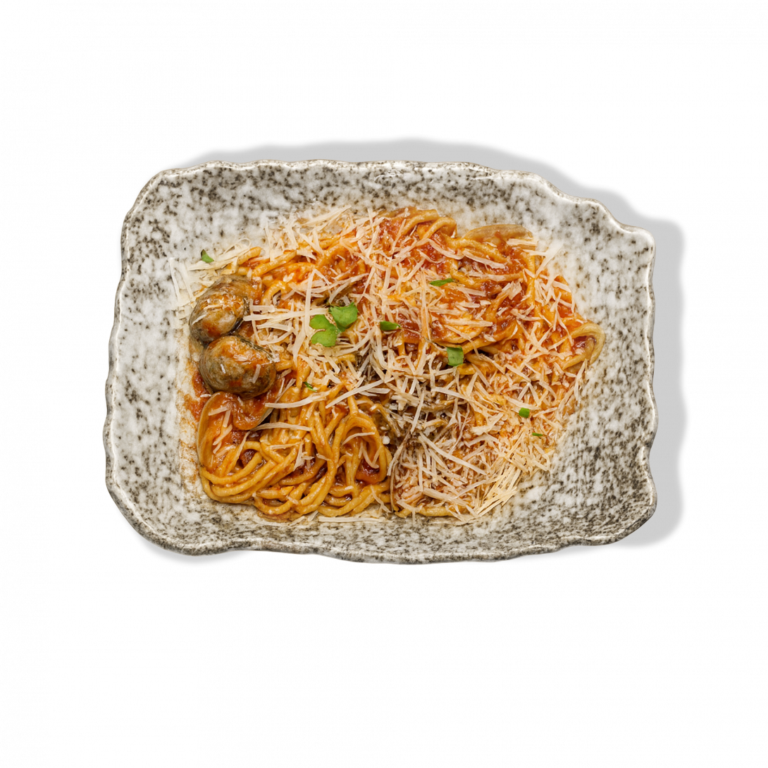 Тонкий вкус морских вонголе раскрывается в насыщенном томатном соусе с луком порей, чесноком и ароматным рыбным соусом. Завершает блюдо тёртый пармезан — сочное, сбалансированное и изысканное сочетание.