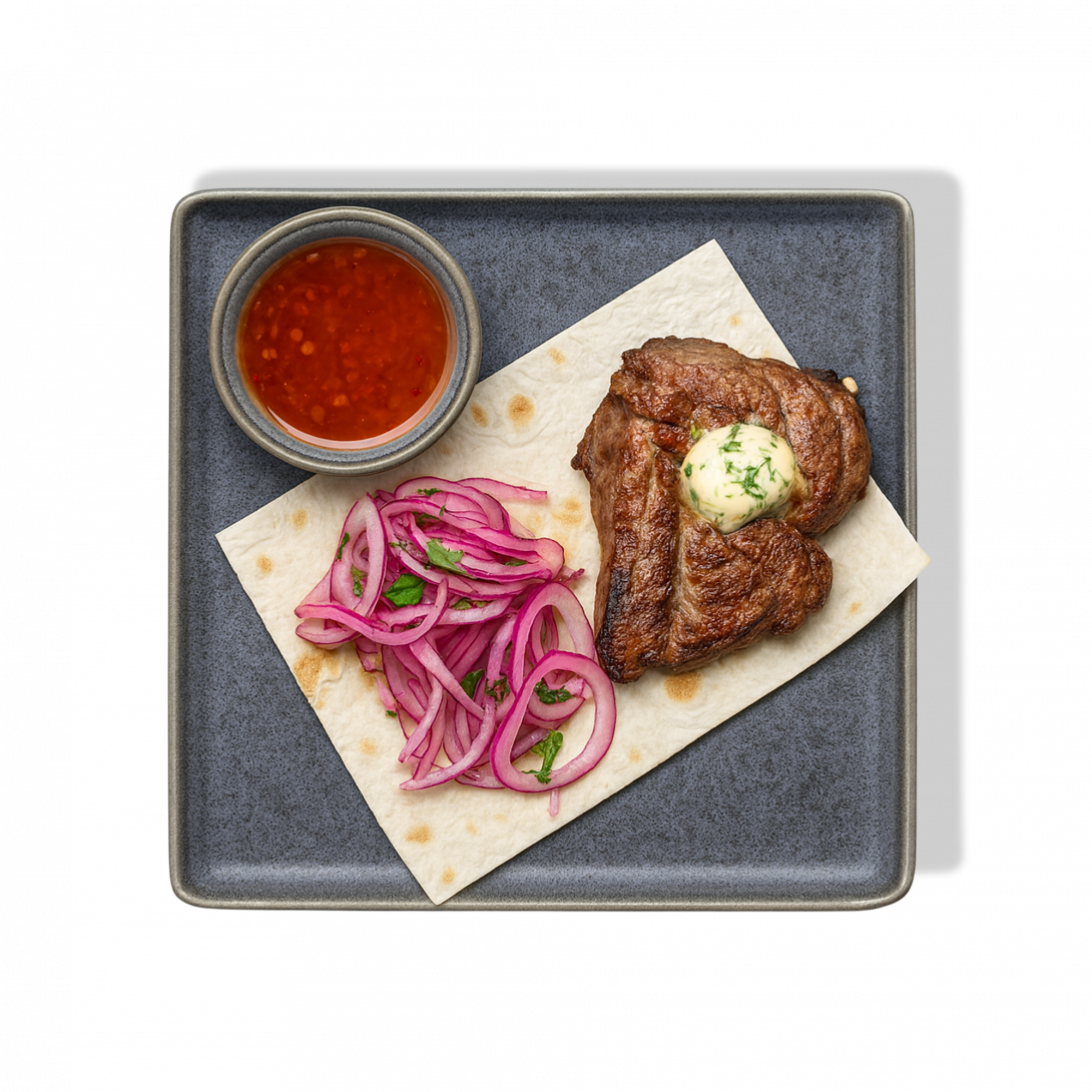 Сочный стейк из свиной шеи, обжаренный до румяной корочки и поданный с маринованным луком. Пряный аромат чеснока и зелени подчёркивает вкус.