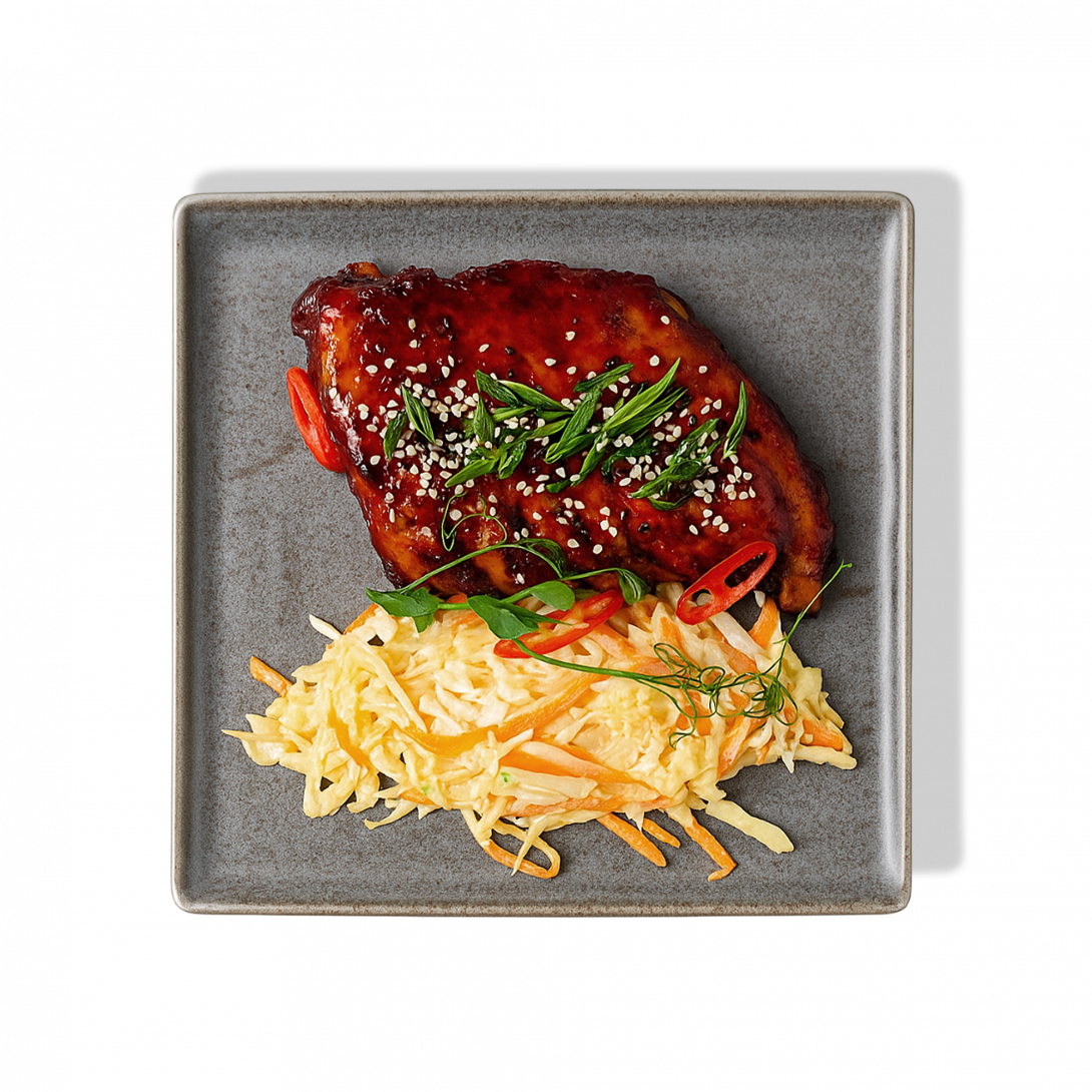 Ароматные свиные рёбра, запечённые до мягкости и покрытые ярким сеульским соусом с восточными нотами. Подаются с хрустящим салатом из капусты и моркови, заправленным лёгким соусом. Сытно, сочно, выразительно.