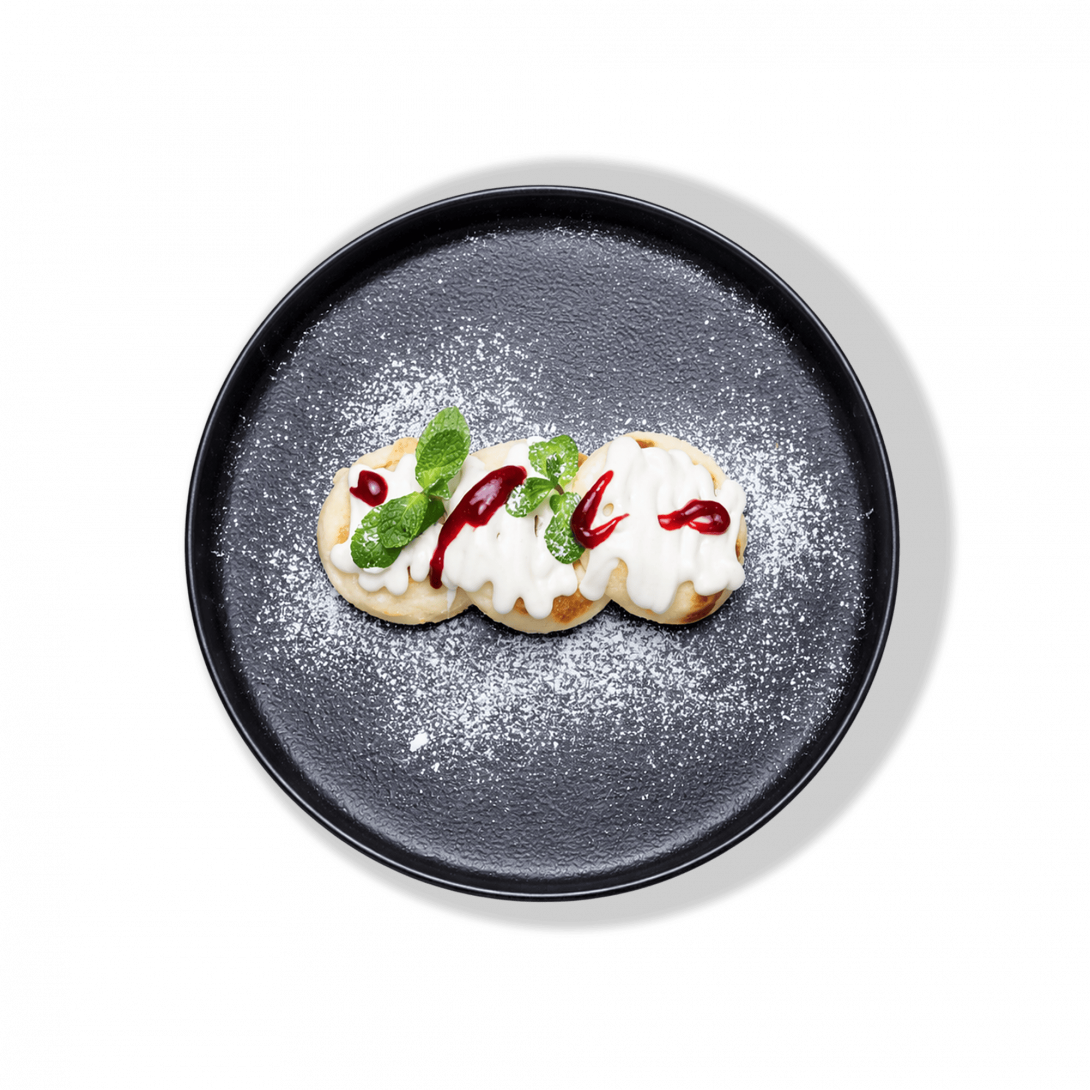 Нежные классические сырники из творога, подаются с воздушным сметанным муссом и ароматным малиновым соусом. Легкий, сбалансированный десерт с ярким вкусом.