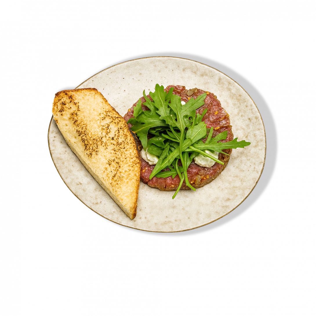 Классическая холодная закуска с насыщенным вкусом. Нежнейшая вырезка, рубленная вручную, подаётся с хрустящей чиабаттой и пикантными акцентами — всё для яркого, сбалансированного старта.