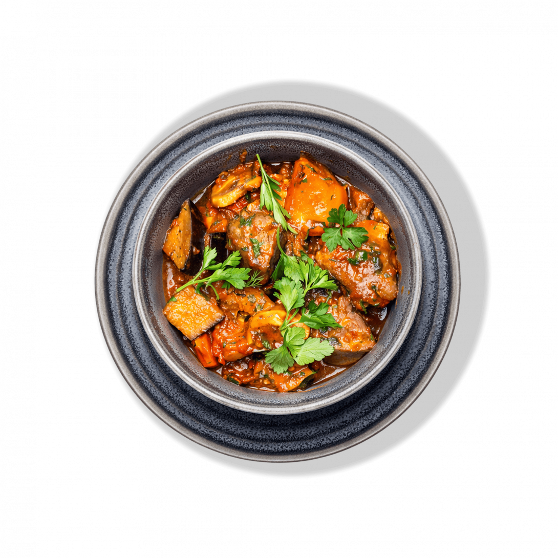 Сытное домашнее блюдо в насыщенном томатном соусе: сочные кусочки свинины, ароматные овощи и пряные травы — всё, как в любимом семейном рецепте.